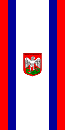 The flag is vertical, divided in vertical red-blue-white-blue-red stripes in proportions 4:4:13:4:4 and with the coat of arms in the middle of the white stripe. The size of the coat of arms is not prescribed in the Decision.