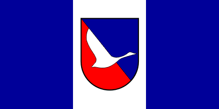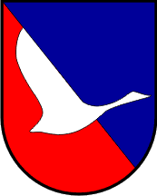 The coat of arms of Šmartno ob Paki is "Per bend azure and gules overall a goose argent volant to sinister".