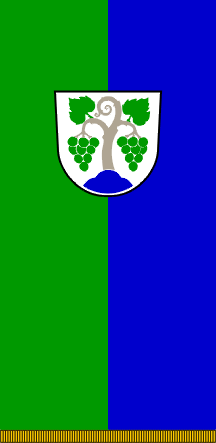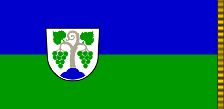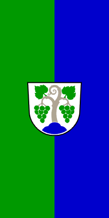 This is a modernization of the town coat of arms recorded in 1689. The blazon of the modern coat of arms is "Argent on a triple mount azure a vine tree proper with two bunches of grapes vert and two leaves of the same".
