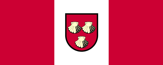 The flag is based on the coat of arms. It is vertically divided wine red-white-wine red with the coat of arms in the middle.