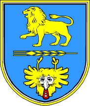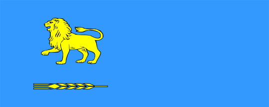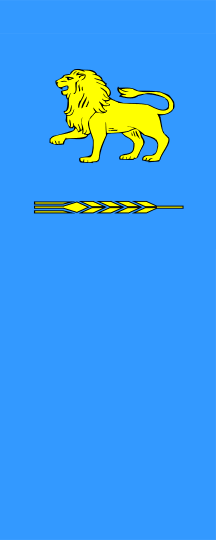 The flag is described as horizontal, in proportions 2:5, blue with the lion and the wheat ear from the coat of arms placed in the left square of the flag. However, on the picture, the charges are placed somewhat closer to the center of the flag.