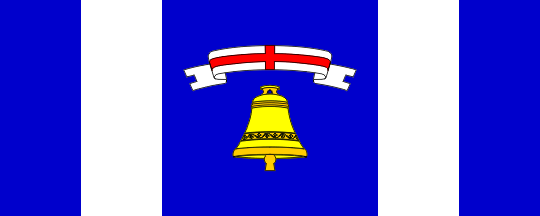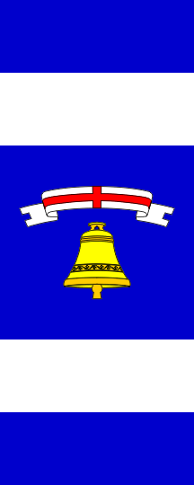The flag is rectangular, in proportions 2:5, blue with two vertical stripes of white, the middle blue field being a square containing the bell and the St. George's ribbon from the coat of arms.