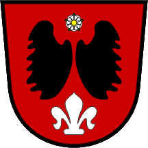arms of the town of Žalec, "Gules a pair of wings sable in chief a rose argent barbed and seeded proper and in base a fleur-de-lis argent", as its own.