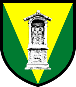 According to the municipal website, the monument shown on the coat of arms is a tomb, part of a well-preserved Roman necropolis discovered in 1952 on the route of the former