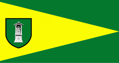 The flag of Šempeter, as shown on the municipal website, is green with a yellow triangle stretching over the whole flag and the community coat of arms (with a plain green shield) placed near the hoist.