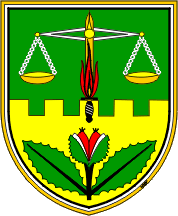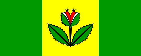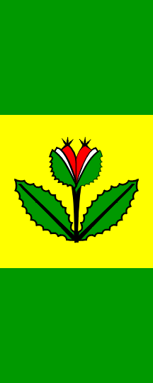 The flag is rectangular, in proportions 2:5, vertically divided green-yellow-green, the yellow stripe forming a square containing the chestnut from the coat of arms. There is no data on possible vertical hoisting. Probably the chestnut size is determined by the Decision to be between 2/3 and 8/10 of the hoist size.