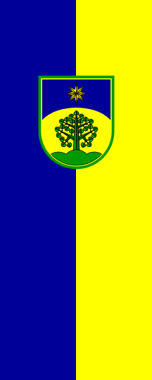 The flag is vertical, vertically divided blue-yellow with the municipal arms in the middle, offset to the top of the flag.