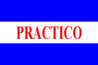 Horizontal blue-white-blue ensign with PRACTICO in red in the