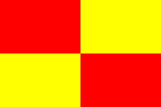 - divided horizontally and vertically, with the upper hoist quarter and the lower fly quarter red, the other two quarters yellow;
