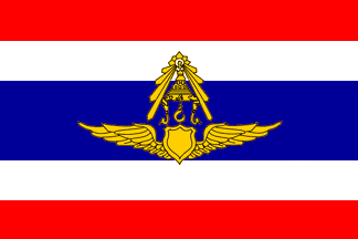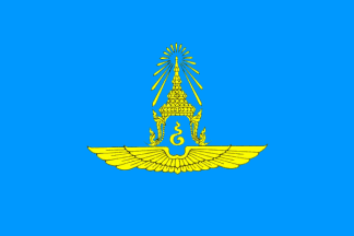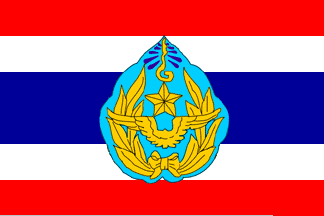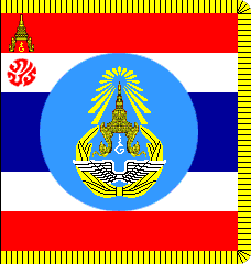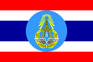 This tricolor flag is similar in design to the national "Trairanga". In the top left-hand corner – the one next to the flagpole – stands the Royal Crown together with an ordinal number – in yellow – depicting the King's place within the dynasty as a whole. Beneath this are the Royal initials in red, trimmed in yellow. As a final touch, blue shards light radiate from top of the crown itself. In the middle stands a blue circle with the Air Force's coat of arms in the center. Along the inner edge – i.e. the one next to the flagpole – runs a red-and-black cord. The other three borders are trimmed in yellow braid, 2 cm. wide. [Similar to the Air Force Flag 1936-1962, above, but with a circular emblem and with crown and initials.]Also known as the "Chaichalermpol flag", the Air Force flag first made its appearance in B.E.2479 [1936 AD], with one minor change, namely the addition of the Royal emblem in the top left-hand corner next to the flagpole itself. The flag shown here was first used in B.E.2505 [1962 AD]. Nowadays, there is a new design which was created following a special Royal Decree, issued in B.E.2522 [1979 AD], concerning flags.