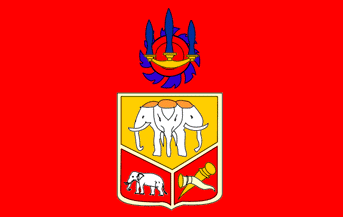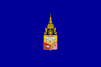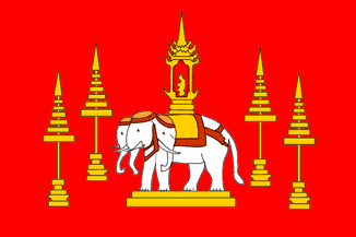 The Judhathippatai is a red flag with a beautifully caprisoned triple-headed elephant facint ["facing"?] the flag pole. On its back rests a howdah carrying the Royal Insignia. On the insignia itself one can see the initials "Jor-Por-Ror" – the initials of King Rama V, otherwise known as King Chulalongkorn, while above it stands a Pra Kiew or coronet. At the front and back of the elephant are more items of Royal regalia in the form of two multi-tiered white canopies. [Similar to th-kngpr.gif "Royal Flag when the King is not present" above but with green coloured "multi-tier canopies" and improved detail.]This flag was first used as the national flag in B.E. 2434 [1891 AD] during the reign of King Rama V. Essentially, it replaced Ayyarapot flag created during the reign of King Rama IV and was designed to be flown over the Palace whenever the King was not in residence. It was used as a departmental flag by officers from the Military whenever they were sent on a mission during wartime. The flag, which remained in use right up until B.E.2440 [1897 AD], denoted the presence of the King or was used by officers from the military when lining up on parade to welcome royal dignitaries from abroad. Later, another Ayyarapot flag was created, somewhat similar in appearance to it predecessor, except for the fact that the "howdah" on the elephant's back carried the sacred syllable "Unalome". It was in use until B.E.2453 [1910 AD] when King Rama VI introduced a new Royal flag.