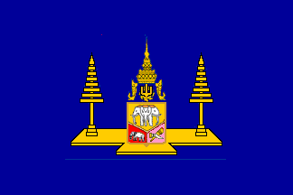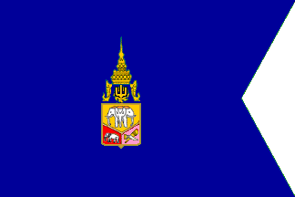 This dark blue flag [like th-heir.gif by Jaume Ollé but with B++ instead of B-- and smaller elements], measuring 5 by 6, contains the national coat of arms in the middle. The coat of arms itself is divided into three sections, the triple-headed white elephant fully-caparisoned against a plain yellow background on top symbolizes northern, central and southern Siam, the white elephant against the pink [sic: red] background in the bottom right hand section represents Laos while the crossed curved and straight daggers against a red [sic: pink] background in the bottom left hand section symbolize Malaya, supporting the Chakkra with a trident through the center, on the top of which is the Crown. Flanking the coat of arms stand two five-tiered canopies.This flag was flown [from] the must [sic – maybe "mast"?] of the Royal Yacht of ["or"?] a battleship carrying the Crown Prince whenever he was on an official trip. It denoted the presence of ["on"?] board of the Crown Prince. The flag was in use from B.E. 2440 [1897 AD] until the end of King Rama V's reign in B.E. 2453 [1910 AD].
