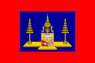 This dark blue flag measuring 5î by 6î [sic – elsewhere these î "units" are omitted, so they are probably wrong here – I guess they are ratios rather than actual measures, since measures are in cm elsewhere] carries the national coat of arms in the middle, above which hovers the Chakkra or Royal Wheel with a trident through the center. Above the "Chakkra" stands a crown.The Rajawong first made its appearance during the reign of King Rama V [1868-1910 AD] in accordance with Royal Decree R.S.116. It was flown from the main mast of the Royal Yacht or of any battleship carrying a member of the Royal family on an official visit. It denoted the presence on board of a senior member of the Royal Family, one deemed worthy of a 21-gun salute to be accompanied by the ship's officers lined up on parade, together with a full parade of military officers and a band playing the Royal Anthem. Lesser members of the Royal Family needed to have special permission from His Majesty the King before using the flag, which remained in use until B.E.2453 [1910 AD].