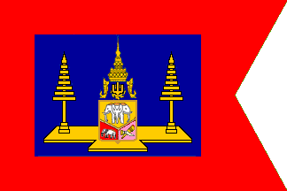 This red flag [like Royal Flag when the King is present, only adding a red swallowtail formed by two vertically opposite triangles whose ratio is 5:3 – hoist:fly as usual – and possibly changing light blue to dark blue], measuring 10 by 15 with one side cut into the shape of a bird's tail and the apex reaching a quarter of the way along the flag's total length, contains a dark blue rectangular measuring 6 by 8, in the middle of which stands the coat of arms – similar to the one on the Baromraj-thawach-maha-siamindra.This flag which first appeared during the reign of King Rama V [1868-1910 AD], was designed for the exclusive use of the Queen. From B.E. 2440-2453 [1897-1910 AD] it was flown from the main mast of the Royal Yacht during official royal trips.