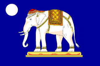 The Governor's Flag is a red flag with a white elephant – in full caparison – standing on a raised dais. In the top left-hand corver [sic], there is a white circle, the diameter of which is one fourth of the width of the entire flag. In the middle of the circle stands the city's coat of arms. [Like the War Ensign 1891-1917 with city coat-of-arms inside a circle on the canton and a smaller elephant, slightly offset towards the fly.]The flag, which first made an appearance in B.E.2434 [1891 AD], was known as "The White-Elephant-on-a-Platform Flag". The version shown here is the one used in B.E.2455 [1912 AD] by the Governor of Ayudhya during the reign, of King Rama VI. Governor's flag of this type were adopted for only a short period of time before their use was discontinued.