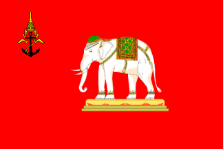 This is a red flag with a white elephant in full caparison – standing on a raised dais facing the flagpole. In the top right-hand corner is a yellow crown above a black anchor with a yellow cord dangling from it.