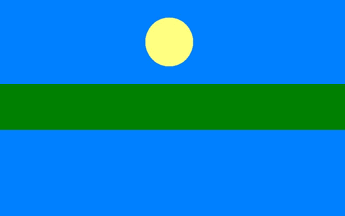 Blue-green-blue, ratio 2-1-2, with a yellow disk centred in the upper band.