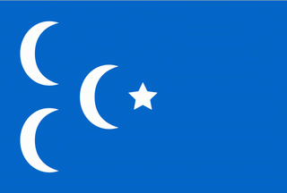 The flag of IBDA-C is blue with three white crescents arranged in a triangular pattern at hoist. The inner crescent is accompanied by a white 5-pointed star.