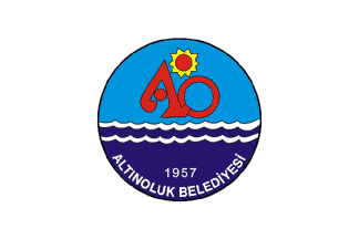 The flag of Altınoluk (photo) is white with the municipality's emblem. "ALTINOLUK BELEDİYESİ" means "Altınoluk Municipality".