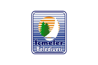 The flag of İçmeler (photo) is white with the municipality's emblem. "İÇMELER BELEDİYESİ" means "İçmeler Municipality".