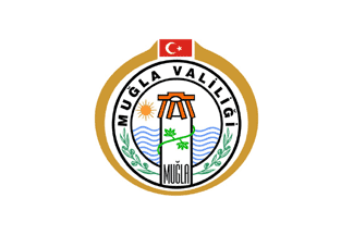 The flag of Muğla Province (photo) is white with the province's emblem in the middle. "MUǦA VALİLİǦİ" means "Muğla Governorate".