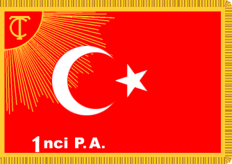 corner; the disk of the sun is filled red, with the monogram "TC" (for Türkiye Cumhuriyeti, Republic of Turkey) inscribed on it. The gold rays extend downward and toward the fly. Over all on the center are the white crescent and star as on the national flag, and near the lower edge the abbreviated title of the unit to which the color belongs (in the illustration, "1nci P.A." is the abbreviation for 1st Infantry Regiment.