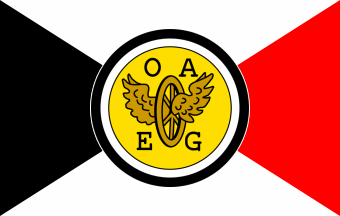 The flag of the East African Railway Company was a black and white red diagonally divided flag, on which a circular winged track, as well as the initials of the company, centered on the flag.