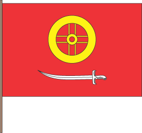 "Gules; or mill wheel, accompanied in base by argent cossack