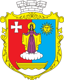 Per pale by gules and azure; Virgin in dress purple and raincoat