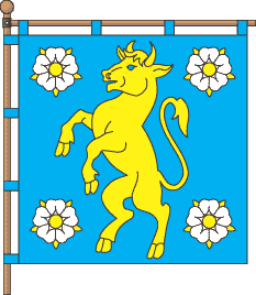 blue panel, in the center stands rampant yellow bull, in the
