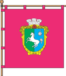 square crimson panel, in the center is the arms of city in