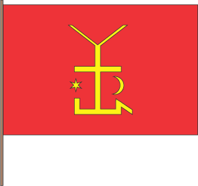 "Gules; or cross with splitted bottom beam, accompanied in