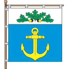 is an or anchor. In argent chief are seven oak leaves and two or