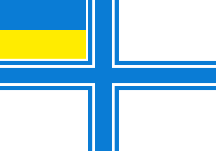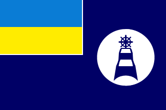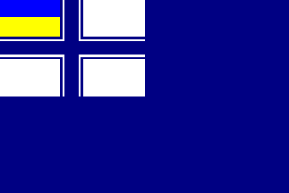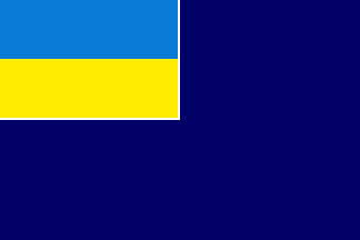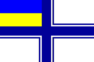 The war flag (naval ensign?), jack, and flag of the Border Guard are shown in colour in the latest issue of Info-bulletin, 1996. There is no explanation or documentation. The war flag is shown as a consisting of a dark blue cross on a white field. In the canton is the light blue over yellow with the arms (yellow trident on yellow bordered light blue shield) set on a white disc in the centre. The jack is light blue over yellow with the trident arms on the circle in the centre. The flag of the Border Guard is the same kind of canton set on a green field. All flags are about 2:3 in proportions.