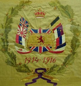 I possess a patriotic tapestry, which bears the flags of the Allied Powers in the First World War, at the time 1916. I have identified the flags of Great Britain, Japan, Serbia, Italy, Belgium, Montenegro, Russia and France. I am curious about the original purpose of the tapestry. I bought it second-hand, and I do not know its provenance. It bears a Lion Rampant in the centre escutcheon. It also bears oak branches tied with a purple ribbon; I am unclear of the symbolism of these features. The background material is olive drab, which has strong military connotations. Perhaps it was meant for a Highland regiment in Canada or Britain.