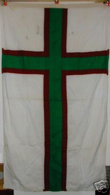 2. In an unidentified painting that was used as an illustration in the television programme about David Tennant in the series "Who Do You Think You Are?" (Dr. Who). The painting is a general view of Londonderry walls and the river Foyle, and includes one of the three ships that broke the bar across the river and thus ended the siege of Londonderry in 1689. The ships were the warship 'Dartmouth', and merchant ships "Mountjoy" of Derry and "Phoenix" of Coleraine. The cross probably has white fimbriations, and there might possibly be something at the centre of the cross.