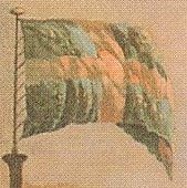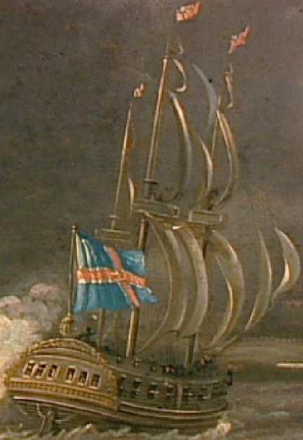 1. In a painting of a ship built in 1637 as "Sovereign of the Seas," re-built in 1660 as "Sovereign," re-built in 1685 as "Royal Sovereign," and destroyed in 1697. The right half of the painting is a portrait of Peter Pett who built the ship, while the left half is a stern view of the ship. A red flag with a small St. George canton is at the stern and high above it on the main mast flys a red St. George's Cross on a blue fielded flag.