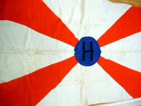 I'm going nuts trying to identify a WW2 Flag brought back with German war stuff and Japanese. Most items were German, all real. The flag looks a bit like a U-boat flag. Has red rays to 4 corners with something in center or flag. Is white field, red rays to 4 corners and has a black H in blue circle in center of flag. Stitching is similar to Kreigsflag edge. unmarked about 5ft. x 31/2 ft. I attach a picture. Any help would be appreciated.