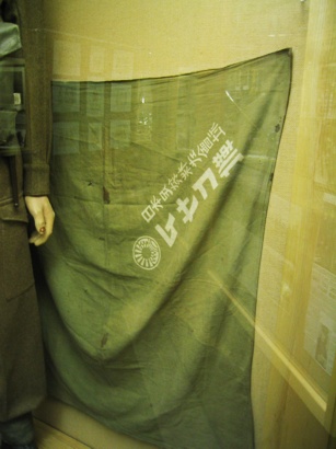 I'm no expert, but the flag/cloth is upside down and backwards. The first two kanji reads "Japan" (Nihon). The kana reads "asahi" (sunrise). Zach Harden says its appears to be an ad banner for the Asahi Shoe Company.