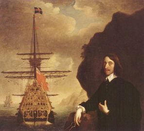 James Taylor in "Marine Painting" wrote that Sir Peter Lely (1610- 1670) painted the portrait and the landscape, while the ship may have been by Lely, or done separately by Issac Sailmaker (c1633-1721). The National Portrait Gallery now describe it as "possibly after Sir Peter Lely, probably 18th century." Marks in each quarter of the flag might be emblems, or might be shading.