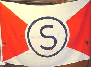 the The Mystic Seaport Foundation website, lists Pittaluga as being a company with no house flag in 1912, and doesnot have an illustration of a house flag that resembles the one in thephotograph. Pittaluga was the Italian company that had a red diagonal bearing white stars on a blue flag in 1957.