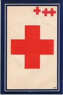 Any help on identifying the attached flag? The number at the bottom is 1919. I was given a gift of a paper flag, it is dated 1919, it has a big red cross in the center, a wide dark blue outside border, then a thin white border then a narrow blue border, when you lay it flat in front of you to the left of the red cross there are three little red crosses. Someone suggested that it might be a quarantine flag that appeared on the houses at that time, others have said maybe on a Red Cross ambulance. Any help you could give would be appreciated I would just like to know more about it.