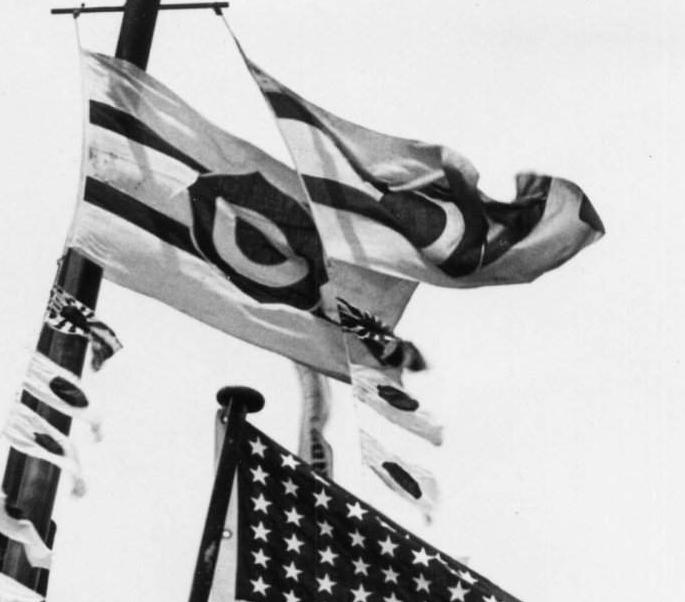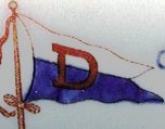 This pennant, white over blue with a red D, is the burgee of the Detroit Boat Club, the oldest rowing club in the United States, founded 1839.
