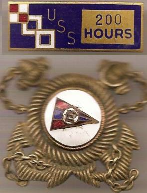 The top badge showing three signal flags and the initials USS is that of the World War II United Seaman´s Service, whose duties are described as "serves war-battered merchant seamen on the six continents." The 200 hours reflects the volunteers service in the merchant marine, in a combat zone I believe. This emblem of the three signal flags is seen on a poster promoting the National War Fund which is illustrated in NAVA NEWS 189. If anyone wants pdfs of these issues of NAVA NEWS, the issues I edited are located at http://www.vexman.net/nnpdf/ and you can find the ones referenced there by issue number.