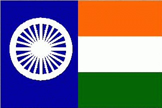 An unknown Indian flag. Description: It is a Indian tiranga (tricolour) using the colours saffron, white and green. Saffron is a little bit darker than the first colour of the current national flag. At the hoist is a blue rectangle