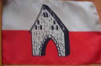 This white over red horizontal bicolour table flag has in the centre a grey, masoned gate with an open door, eight windows and a triangular roof. I first spotted this flag on 28 May 2004, in Hamburg St. Pauli. I’ve been trying to identify this flag for more than 4 years without any success. I spotted this flag in a pub together with many houseflags of shipping companies. I believe that the flag is about 60 years old. The colour of the gate might be "stone-grey." As I have never before seen a flag using a "stone-grey" colour, that’s not for sure.