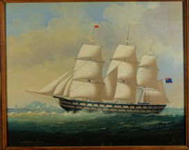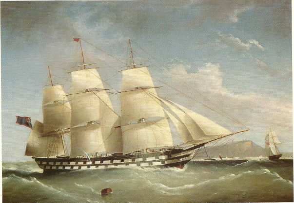 Andy and I have had some small correspondence off-list, however, I can confirm that this is certainly not a vessel of the Royal Navy, for one thing it flies no commissioning pennant, but rather a vane and has a house flag at the fore. It is a merchant vessel of the so-called "Blackwall Frigate" type, however, the two rows of (most probably painted) gunports make it rather unusual since the term "frigate" (in the naval parlance of the time) means a ship which carried her armament on a single deck and all the photo's of Blackwall Frigates I've seen have only one row. The illustration Andy sent also shows no stern gallery, and such a gallery was (from memory) usual for the type? Does this mean that it is an inaccurate picture, I simply don't know, but the other flags seem carefully painted so the red bordered Blue Ensign remains a mystery? If the ship's master and a percentage of the crew belonged to the Naval Reserve, then an undefaced Blue Ensign would be perfectly proper, however, the only red-bordered Blue Ensign I've been able to find belonged to the British Ionian Islands and that was prominently defaced by a gold lion in the fly half (as well as being a long way from the Hebrides). Sorry that I cannot be of more help.