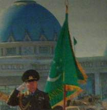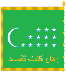 It is a squarish green flag with golden fringes at three sides. In the centre of the flag is a white crescent with an unknown number of stars. At the bottom end is a golden inscription in perso-arabic characters. So my images are mere attempts or in the best case reconstructions. I placed the same number of stars next to the crescent as being upon the national flag. I sent two variants of inscriptions: One [#68b] means "Uzbeskistan" (taken from Arab version of Wikipedia), the other [#68c] is a "shahada". I also have no idea, whether it is a president’s flag or a mere rank flag of the army. My image is based upon a photo [#68a] displayed in SPIEGEL, no.21 of 2008, showing a trooping-the-colour ceremony in Usbekistan’s capital. The man in the car wears an uniform and is probably not President Karimov. This item should be discussed.