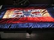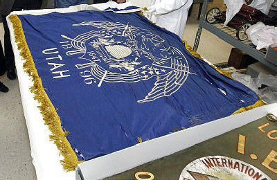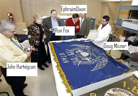 #15d The flags shown in #15b are the recently rediscovered 1903 Utah State flag found in the Utah State Historical Society Museum collection and the other flag is an International Brotherhood of Bookbinders Union (IBB) Local 151 banner. I had little interest in the second artifact since it is a union banner and not what I would consider to be a true flag. However, here is an additional picture of the group of us examining the flags (#15c) and the information I have on the IBofB Union banner. I also include a better picture of the Union Banner. (#15d)