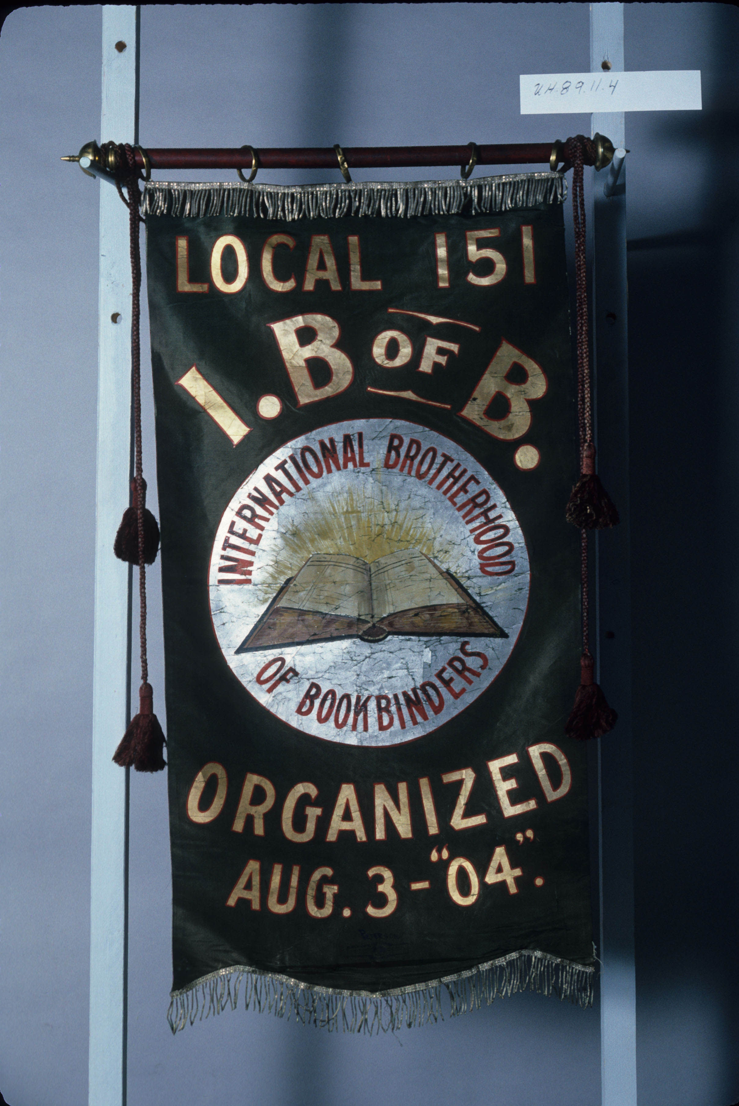 The now retired former director (Phil Notoriani) of the Utah State Historical Society purchased this banner with a group of other union banners in 1989. It is displayed from a cross bar, is in the gonfalon shape, and is a union parade banner. The International Brotherhood of Bookbinders (IBB) initials appear on the flag. As you can see from the photo, it was Local 151 organized Aug 3, 04.